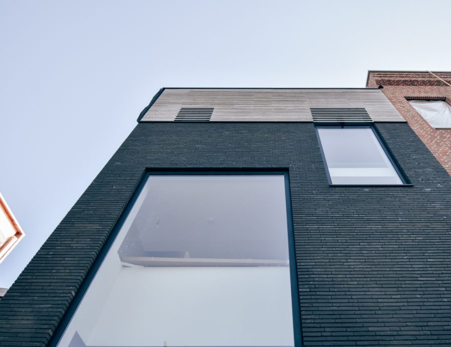 De voorkant van de woning is opgedeeld in vlakken. De houten vlakken in de gevel – horizontale essenhouten latten van Carpentier HOTwood – zorgen voor privacy vanaf de straatzijde en in de badkamer. Op de eerste verdieping, waar de woonkamer is, heb je juist optimaal zicht op prachtige oude bomen en het park. Het donkere vlak in de gevel wordt gemetseld in een zwart gesinterde steen van Rodruza – Hilversums formaat zonder stootvoeg – waardoor het strokenpatroon van de houten latten zich doorzet in het metselwerk.