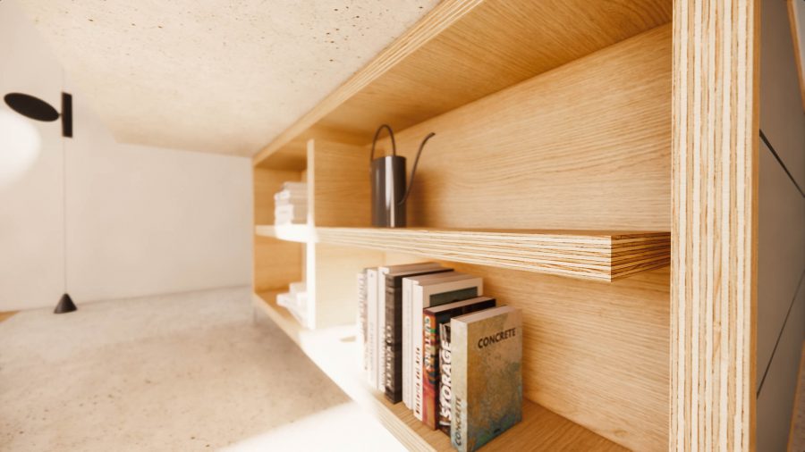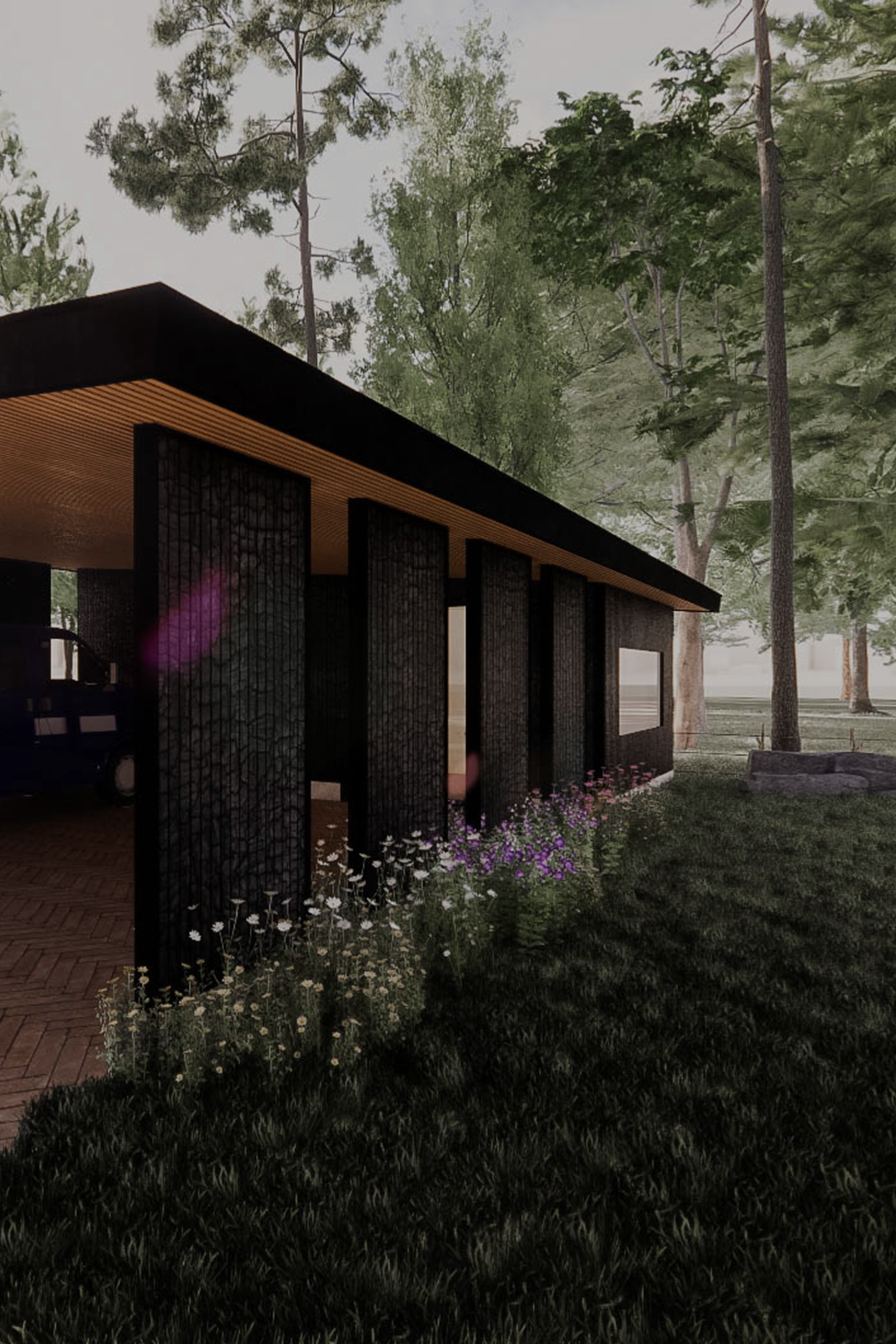 De beste positie voor het bijgebouw – een berging met carport – was voorop het kavel. Belangrijk voor het ontwerp was dus een zekere ingetogenheid. Natuurlijke materialen zorgen ervoor dat dit gebouwtje opgaat in de bosachtige omgeving. De buitenzijde wordt volledig bekleed met shou sugi ban, een eeuwenoude Japanse techniek voor het branden van hout waardoor dit oneindig lang meegaat. Panelen met lamelstructuur geven niet direct zicht op de auto’s onder de carport en hebben tevens een constructieve functie. Het bijgebouw krijgt een lessenaarskap met de lage zijde richting de woning zodat de eigenaren op het natuurlijke sedumdak uitkijken.